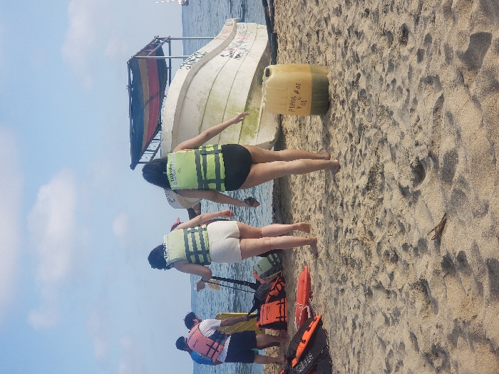 A group of people are on a sandy beach, near a boat. Two women stand closest to the boat, wearing life vests. Nearby, a yellow container sits on the sand. Further away, at least three more people stand, also wearing life vests, near orange life preservers. The sky is visible in the background with some clouds and the sea is calm.