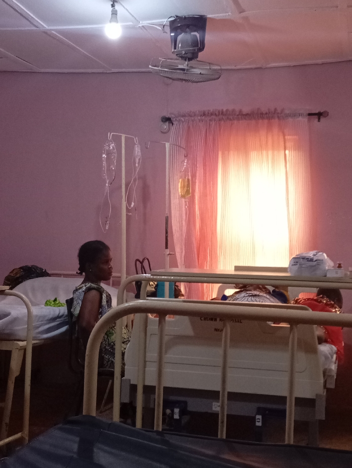 The scene depicts the interior of a hospital room at Crown Hospital in Umuoji, Nigeria
