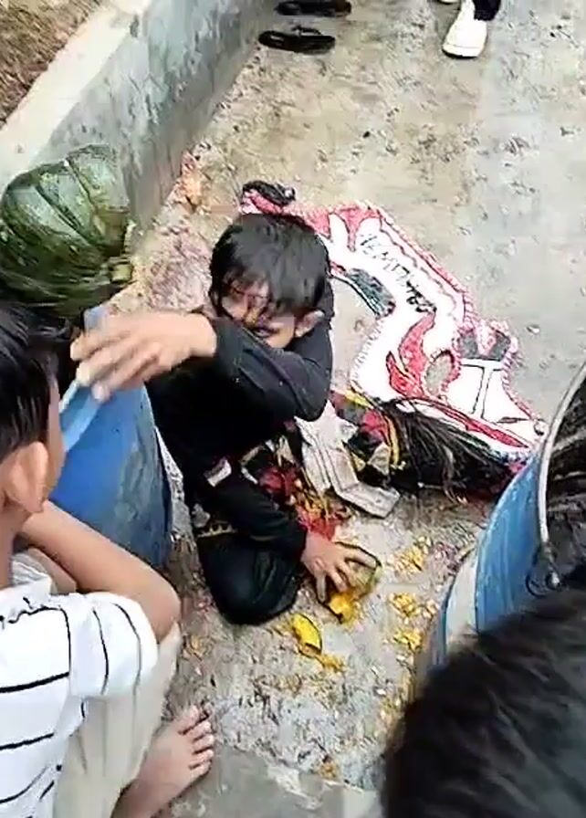 man kneeling on the ground, his hands covered in a yellow substance, possibly a smashed pumpkin or squash. There are other people standing around him, including a young boy with a striped shirt and bare feet, and several women in headscarves. A colorful decorative object is lying on the ground next to the man. People start throwing what appears to be rose petals onto the scene. The event is taking place outdoors. The ground looks like concrete and is wet. There is music playing in the background.