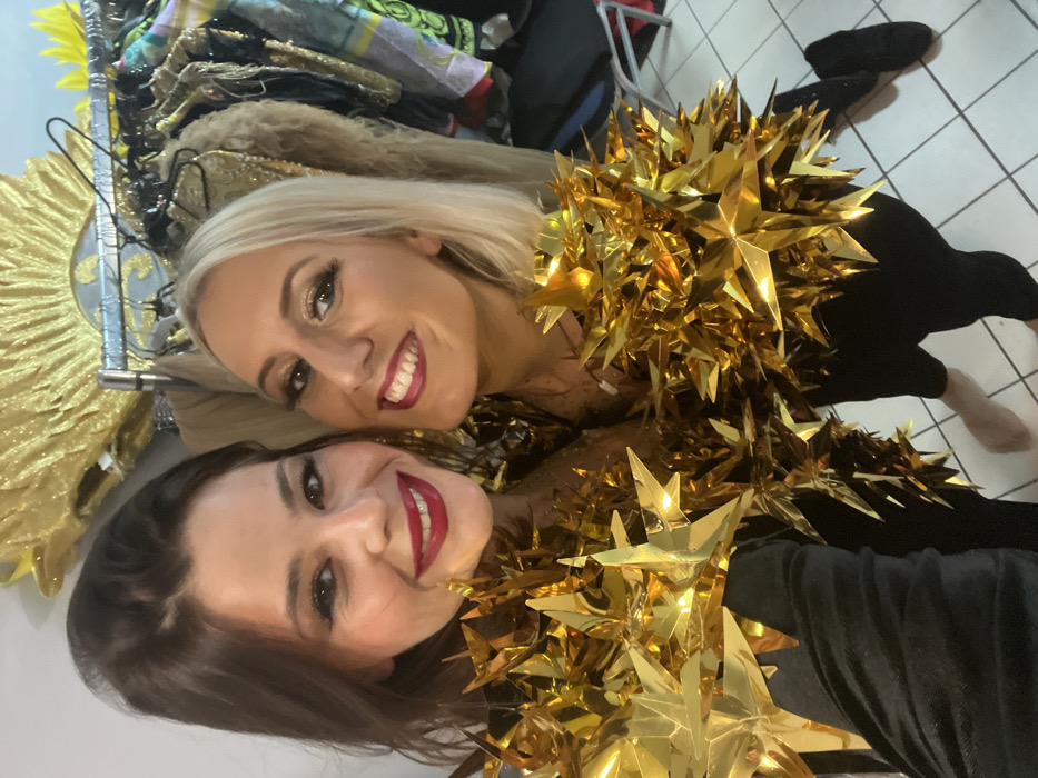 Two women smile at the camera, wearing gold star decorations