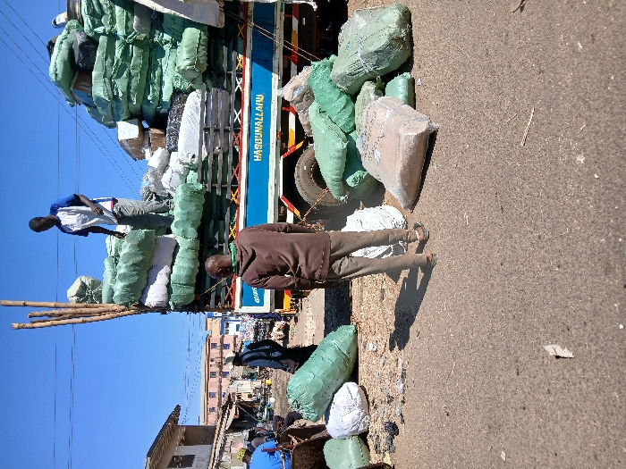 The image displays an outdoor scene in a commercial district of Jos, Nigeria, under a clear blue sky with strong sunlight. A blue and light blue medium-duty truck, bearing the Arabic inscription "HASBUNALLAHU" on its side, is heavily laden with cargo. The cargo, stacked significantly above the truck bed, consists primarily of large, irregularly shaped bundles wrapped in green mesh, along with white and tan sacks and some cardboard boxes. Several bamboo poles are visible vertically integrated into the cargo stack on the truck's left side. Two individuals are prominently featured. A dark-skinned male, wearing a white t-shirt with blue sleeves and grey trousers, stands atop the cargo on the truck, looking downwards. In the mid-ground, another dark-skinned male, dressed in a brown hooded sweatshirt and brown trousers, stands on the asphalt pavement with his back largely to the camera, wearing sandals. His shadow extends in front of him on the ground. The ground is an asphalt surface, scattered with numerous large green, white, and tan sacks similar to those on the truck, and minor debris. In the background, to the left of the truck, several multi-story buildings are visible, including one with light-colored walls, indicative of an urban environment. Faint utility lines are present in the upper left quadrant of the frame.