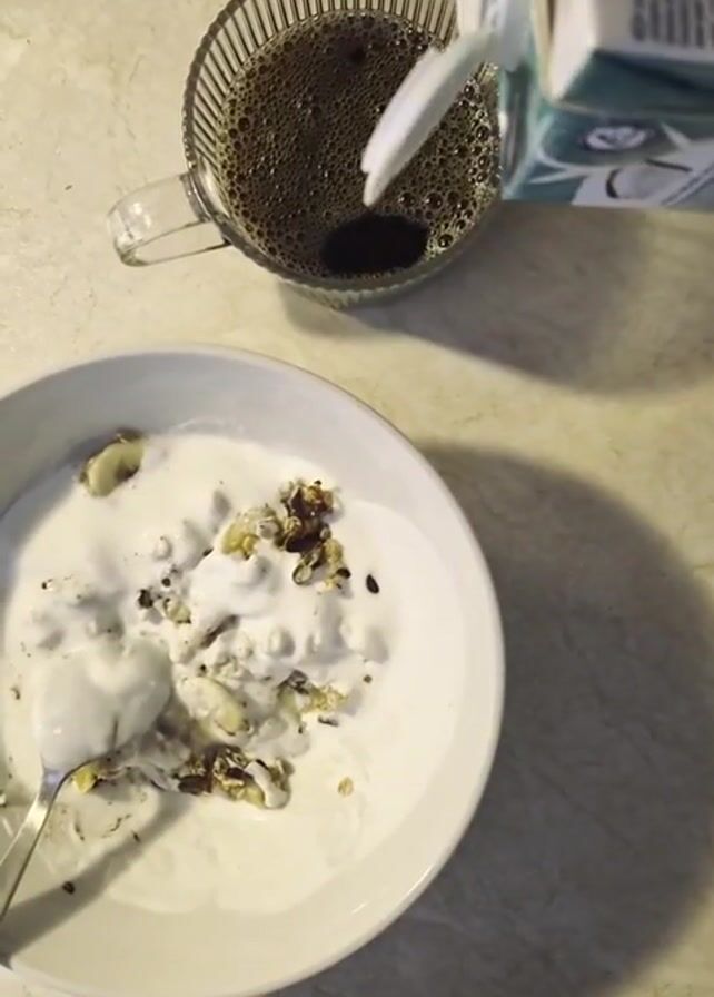 A cup of dark coffee sits next to a bowl of yogurt and granola on a tan countertop. A carton of coconut milk is being poured into the coffee. A spoon is in the yogurt. The scene is shot from directly above.