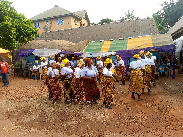 A group of women in matching outfits, including yellow head wraps, white blouses, and patterned skirts, gather outdoors, possibly for a celebration. They appear to be dancing or performing a cultural dance. Tents are set up in the background. A building can be seen in the backdrop on the left side. A man in a red t-shirt is seen standing and watching near some chairs. The ground has a reddish hue.