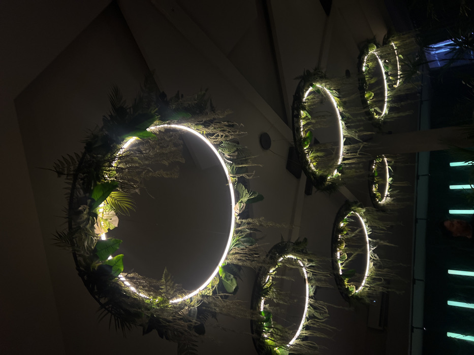 The image depicts an indoor scene in Tibubeneng, Indonesia, characterized by prominent decorative lighting fixtures suspended from a dark ceiling. Six circular light fixtures are visible, each featuring an illuminated inner ring emitting a bright white light. These rings are adorned with artificial foliage, including various green leaves resembling ferns and tropical plants, along with hanging, light-colored moss-like material. The largest light fixture occupies the upper left quadrant, with smaller, similarly designed fixtures receding towards the mid-ground and background. The ceiling and upper walls appear dark, suggesting a low-light environment. In the lower left portion of the frame, the partial profile of an individual's head and shoulders is discernible against a darker background; the person appears to be looking towards the right. Below the smaller light fixtures in the mid-ground, a horizontal row of multiple vertical, glowing green light tubes is visible, providing an additional source of ambient light. Darkened plant-like forms are faintly visible towards the lower right. No specific actions or interactions are clearly depicted.