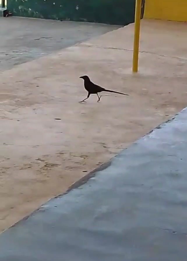 black bird walking on a concrete surface near a yellow pole. The bird has a long tail and is walking towards a crack in the concrete. In the background, another black bird is visible on a grassy area.