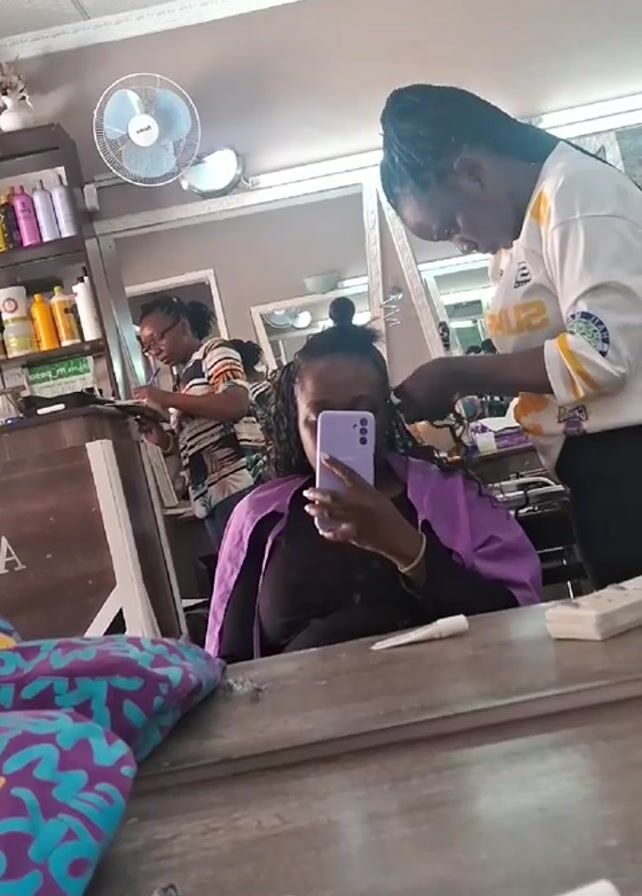 In a small hair salon, a woman sits in a stylist chair, taking a selfie with her smartphone. She is wearing a black top and a purple cape. Behind her, a stylist is working on her hair, which appears to be partially braided or styled. To the left, another woman stands near a shelf filled with hair products, seemingly attending to another client or task. A table in front of the mirror is cluttered with items, including a colorful pillow and a tube of lotion. A fan hangs from the ceiling, providing ventilation to the brightly lit space.
