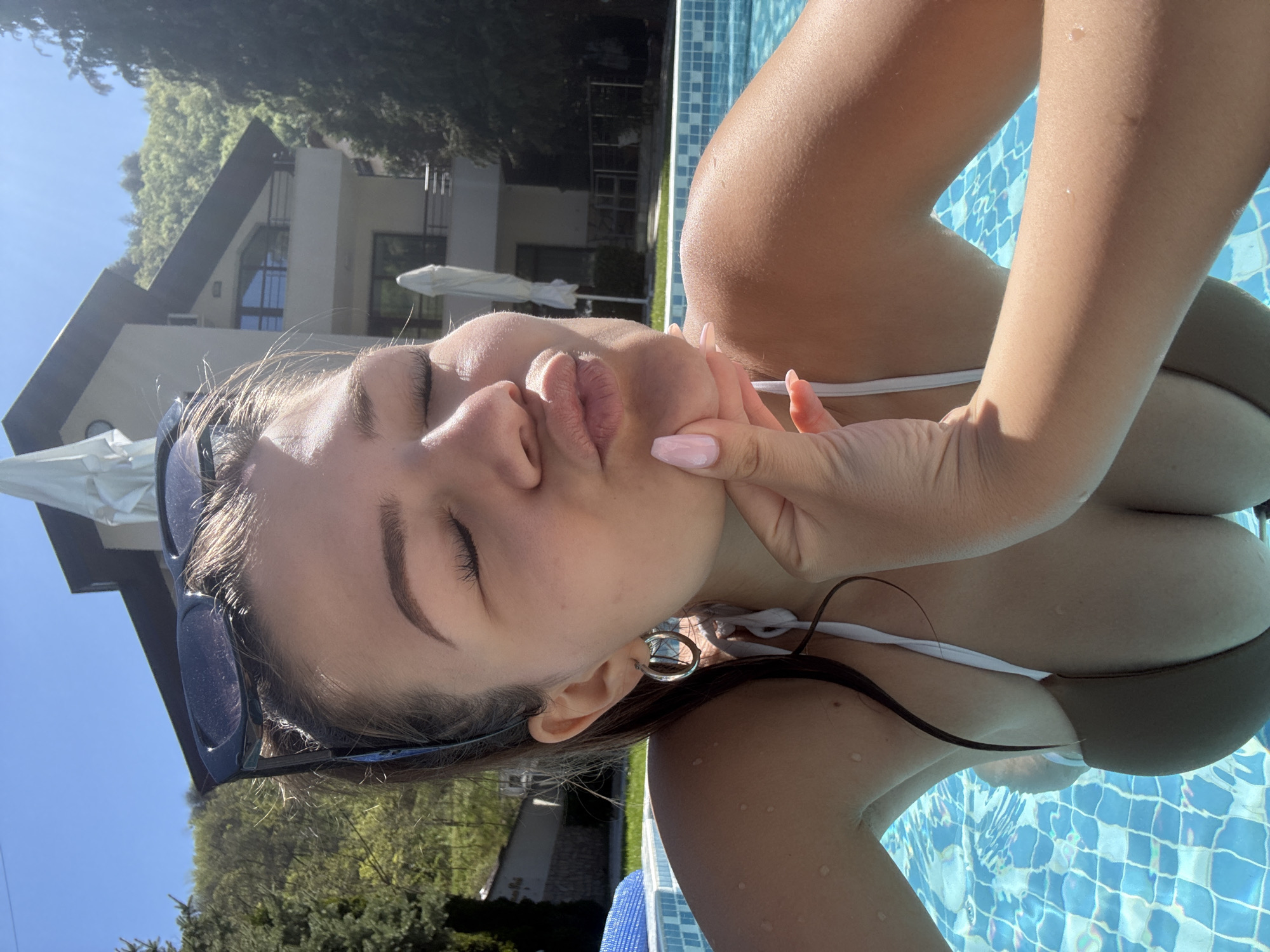 A young woman poses in a pool. She is wearing sunglasses and a bikini. Her eyes are closed and she is pouting. A hand is squeezing her face. The pool is located in Marchevo, Bulgaria. Buildings and trees are visible in the background. The water is blue and reflects sunlight.