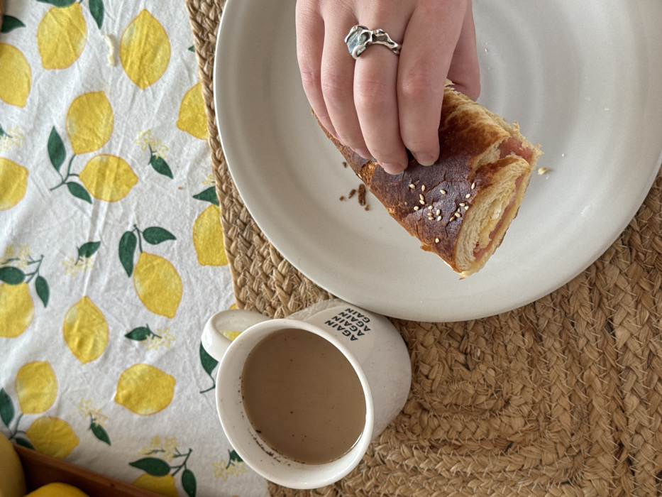 A high-angle indoor photograph depicts a meal setting in Vozdovac Urban Municipality, Serbia. A light-skinned left hand, adorned with a silver-toned ring featuring an irregular light blue-green stone on the ring finger, holds a golden-brown savory pastry topped with sesame seeds. The pastry, cut to reveal layers of dough with a visible filling of ham and cheese, rests partially on a white ceramic plate, which shows scattered crumbs. To the left of the plate, a white ceramic mug with the word "AGAIN" printed vertically multiple times contains a light brown beverage. Both the plate and mug are positioned on a round woven placemat of light brown material. This placemat overlays a white tablecloth patterned with repeating yellow lemons and green leaves/blossoms.