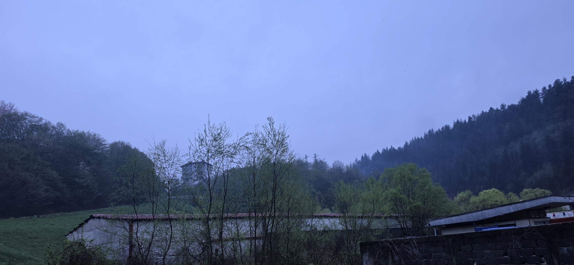 The image depicts a rural scene in Smolyan, Bulgaria on a misty, overcast day. The foreground features a low brick wall and some vegetation, with a long, low-slung building with a white brick facade. Behind it, there are young trees with budding leaves. Further back is a hillside covered in lush green vegetation and trees, and a white building is visible nestled among the trees. A dense forest covers the hill in the background. Power lines run across the scene. A portion of another building with a slanted roof can be seen to the right of the primary building.