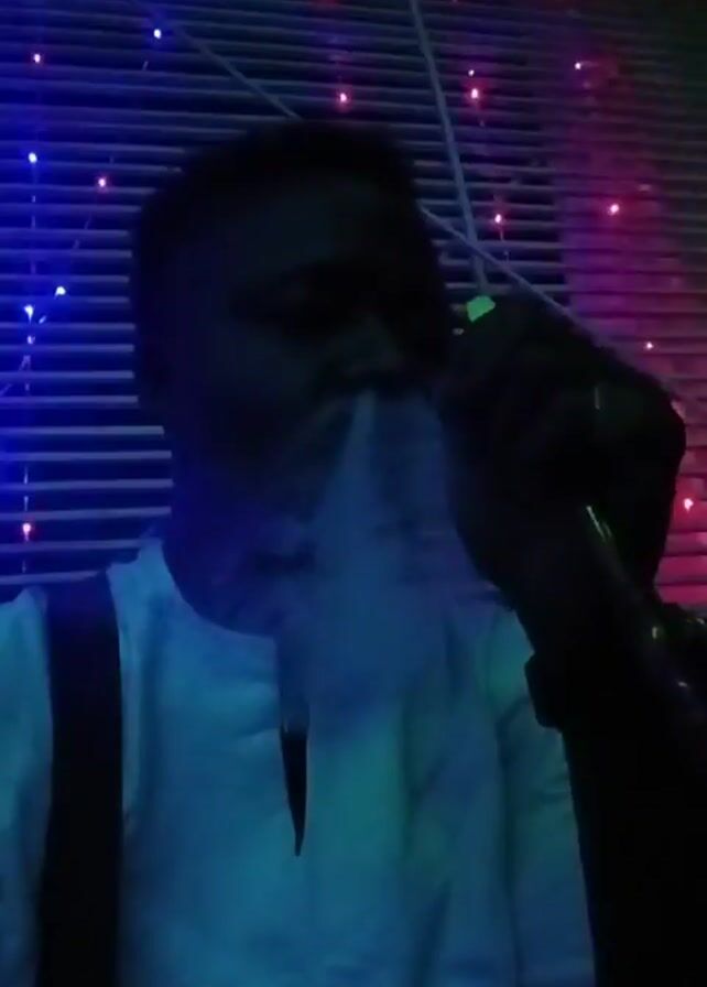 A person is seen exhaling a large cloud of smoke, presumably from a hookah or similar smoking device