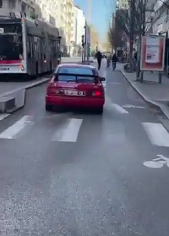 red Lotus Esprit driving on a street. The car is stopped in a bike lane, close to the sidewalk and a bus. There is a person riding an electric scooter and some pedestrians on the sidewalk. The street is located in a city, with tall buildings on both sides. The weather is sunny and clear.