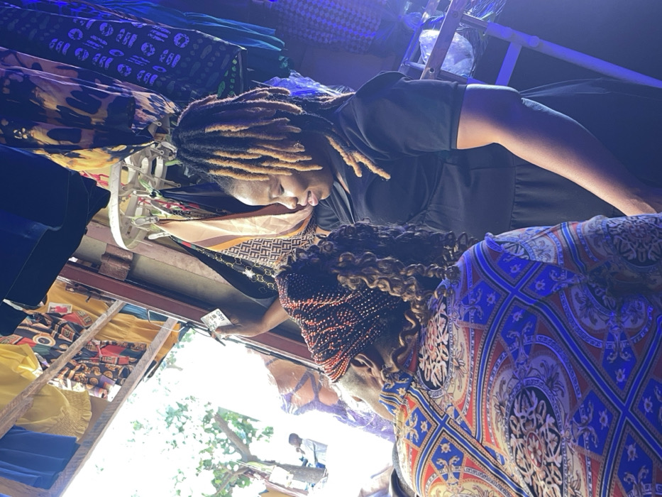 Two women peruse fabrics in a shop. The woman in the foreground is clad in a brightly colored shirt with a red, blue, and gold pattern. She sports a beaded headband and curly hair. The second woman, with dreadlocks, wears a black outfit and examines the fabrics with her. A clothing rack filled with various patterned fabrics dominates the left side of the frame. A white ladder-like structure and a globe light are visible in the background.