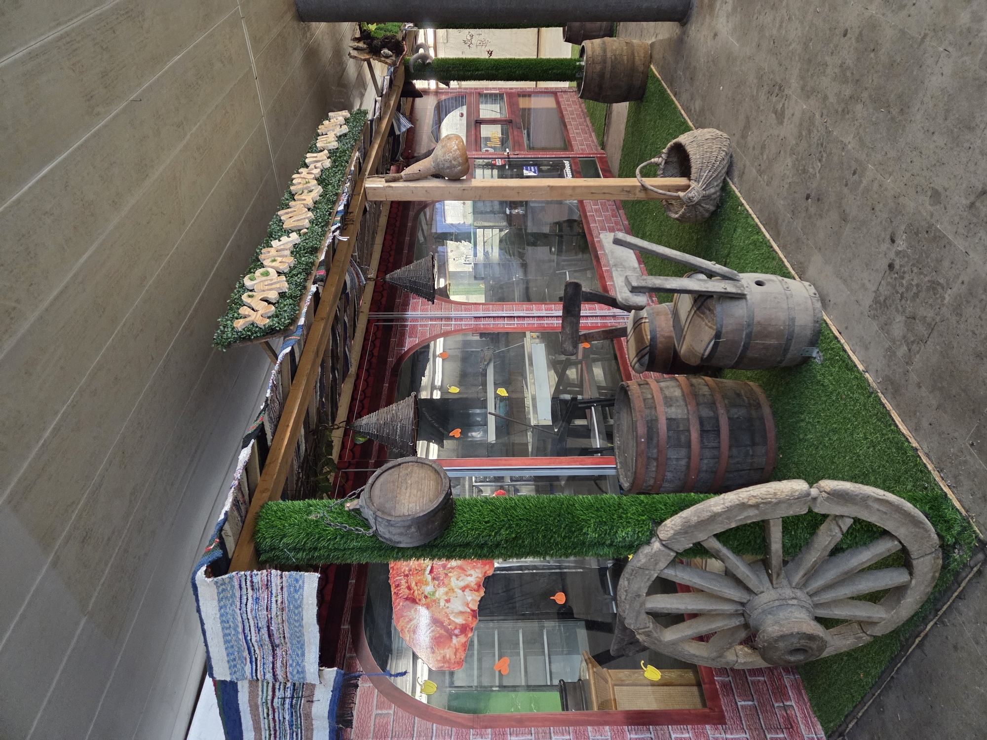 This image depicts a roadside attraction in Varna, Bulgaria, showcasing a rustic, old-fashioned design. The display includes wooden barrels, a wagon wheel, and various agricultural tools arranged on a patch of artificial turf. The facade of a building is adorned with a sign made of wooden letters and decorative plants. The environment is urban, with a wall visible in the background.