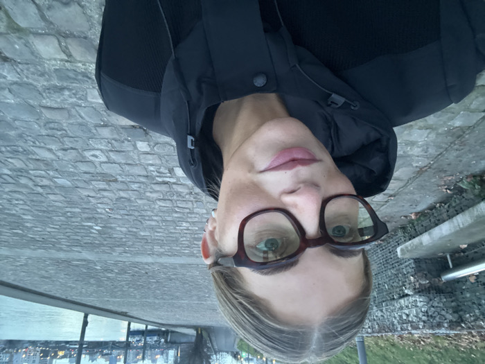 A person wearing glasses and a dark jacket takes a selfie against a backdrop of cobblestone paving and cityscape. The person has blonde hair, fair skin, and is looking at the camera. The background includes a body of water and buildings in the distance. To the right, a metal railing and some greenery are visible. The photo is taken from a slightly low angle.