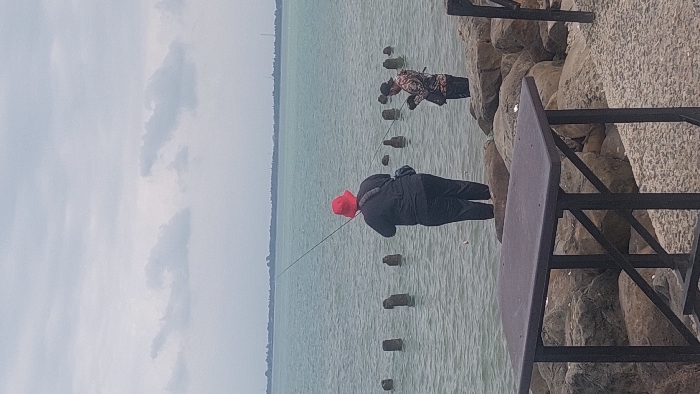 This image depicts a coastal scene in Lhokseumawe, Indonesia, under an overcast sky. Two individuals are engaged in fishing from a rocky shoreline. In the foreground, a dark rectangular table with a black metal frame is partially visible on the lower left, situated on a textured, possibly pebbled, ground surface that transitions into large, irregular rocks. The primary subject on the left is a person of larger build, viewed from behind, wearing a red bucket hat, a black long-sleeved shirt, and black pants. They hold a fishing rod extended over the water. A dark shoulder bag is visible across their back. They stand close to the water's edge, possibly on submerged rocks. To their right and slightly behind, a second individual, wearing a dark baseball cap and a camouflage-patterned long-sleeved shirt, is also fishing, holding a rod and appearing to be actively reeling. This individual stands on prominent rocks above the waterline. The tranquil, greenish-blue sea occupies the midground, with a line of dark, weathered wooden posts partially submerged, extending horizontally across the water. In the distant background, a low-lying landmass with minimal vegetation is visible under a light grey, cloudy sky.