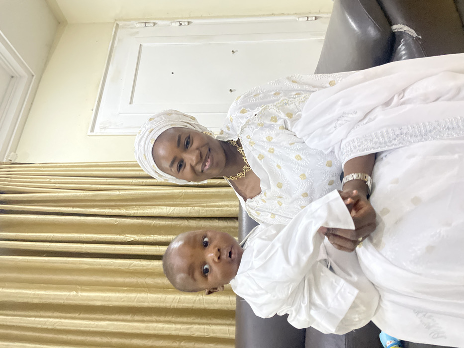 A woman in a white, ornate outfit and head covering smiles beside a young child dressed similarly. They are sitting on a dark-colored couch. The woman has gold jewelry and a silver watch. Behind them are gold drapes and a white door with a paneled border. The image is rotated counter-clockwise, giving a tilted perspective of the scene.