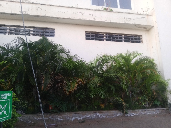 A weathered, white building with horizontal barred windows is partially obscured by a dense arrangement of tropical plants and palm trees. A bright green sign reading "SAFE ASSEMBLY POINT" with a directional symbol is visible in the lower left. An angled pole runs across the image. A concrete curb defines the edge of the planting area. The building shows signs of age and deterioration.