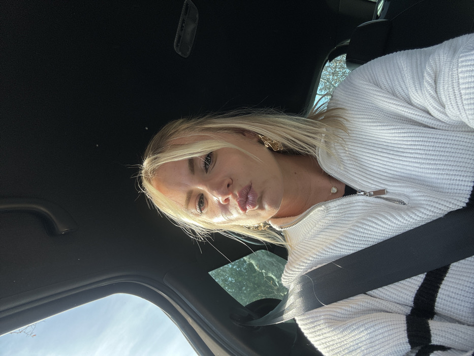 The image captures a fair-skinned female subject inside a vehicle, posing for a selfie