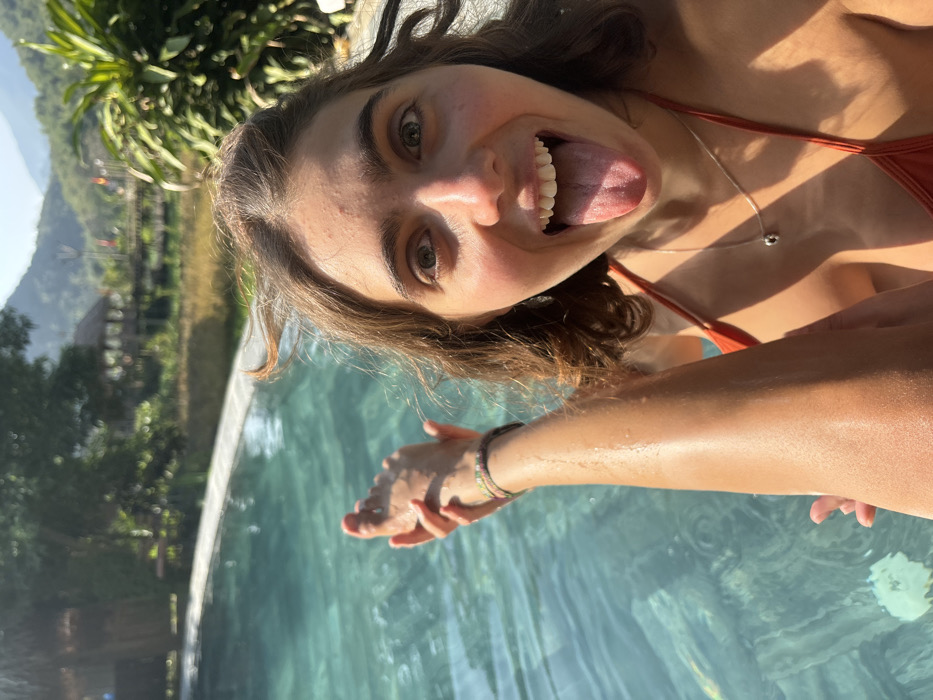 A young woman, wearing a bronze bikini top and silver necklace, stands in waist-high water, sticking her tongue out toward the camera. Her arm extends into the water, revealing bracelets on her wrist. Lush greenery and mountains are visible in the background. The water is clear and calm, with a visible border. The woman's face is tilted, emphasizing her eyes and playful expression.