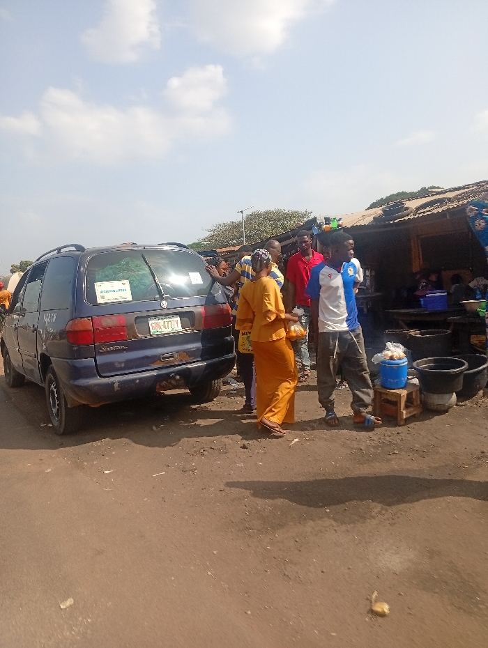 The scene depicts an unpaved roadside environment in Itobe, Nigeria, under daylight conditions with a partly cloudy sky