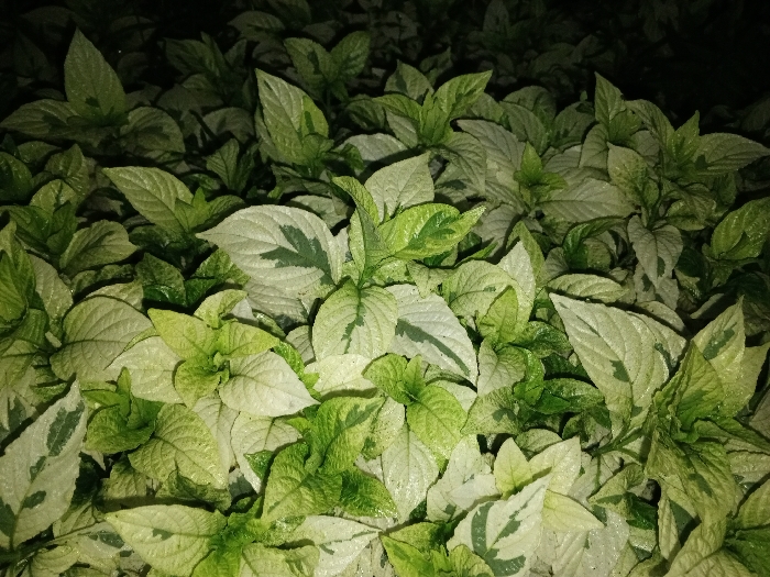 The image captures a dense cluster of variegated foliage, located in Catarman, Philippines. The plant material consists of numerous leaves displaying irregular patterns of light green, off-white, and darker green pigmentation. Some leaves exhibit distinct patches of darker green on a lighter background, while others are predominantly light green or almost white. The leaves are tightly packed, filling the entire frame and creating a continuous textural surface. Subtle surface texture and veining are visible on the leaves, along with what appears to be a slight sheen, possibly from moisture. The scene is illuminated by a direct light source, highlighting the foreground foliage against a darker, receding background. No individuals, discernible objects other than the plants, or specific actions or interactions are present.