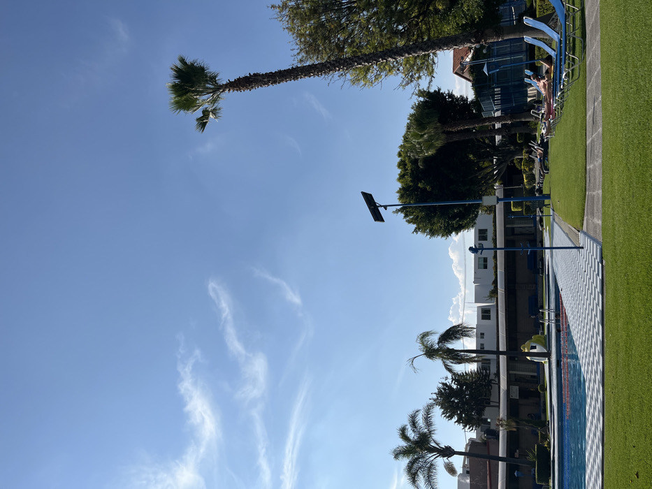 A landscape photo captures a clear blue sky with wispy white clouds. A tall palm tree stretches across the upper portion of the scene, contrasting with a pool area on the right. The pool is lined with light blue and white tiles, green turf, and blue chairs. Smaller palm trees and green vegetation are also visible in the foreground and middle ground, partially obscuring nearby buildings. A solar panel mounted on a tall blue pole stands near the pool.