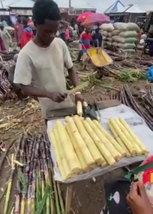 busy outdoor market in what appears to be a less-developed region. A young man is at the center, skillfully cutting sugar cane into smaller, manageable pieces with a large knife. He works on a small wooden table covered with a white cloth where prepared sugar cane stalks are neatly arranged. To his left are bundles of unprocessed sugar cane. The background features many people, some carrying goods in a wheelbarrow. Overhanging tents and umbrellas dot the scene, offering some protection from the sky. The ground appears muddy or damp, suggesting recent rain. A person is shown holding what appears to be money in the lower right corner.