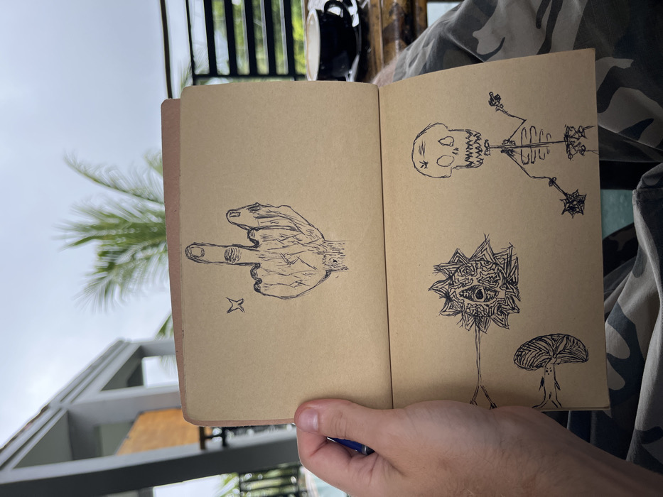 A person's left hand holds an open, kraft-paper sketchbook in Koh Toch Village, Cambodia
