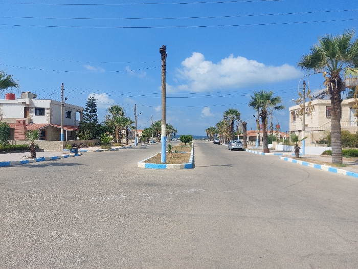 This image depicts a coastal street in Ain az-Zarqa, Syria, under a clear blue sky with scattered white clouds