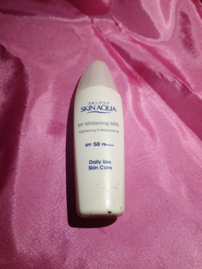 A white bottle of "Skin Aqua UV Whitening Milk" sunscreen. It claims to lighten and moisturize. The label indicates SPF 50 PA++++. The bottle's design is a rounded triangle, and it reads "Daily Use Skin Care." The bottle appears to be sitting on a pink, textured surface.