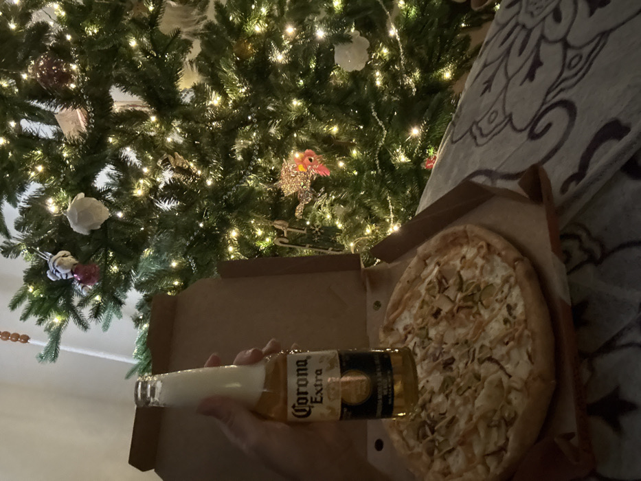 A Christmas tree adorned with lights and ornaments looms over an open pizza box. A partly consumed pizza rests inside. A hand holds a bottle of Corona beer close to the pizza. The scene appears to be indoors with a blanket or throw visible in the background, possibly on a couch or bed.