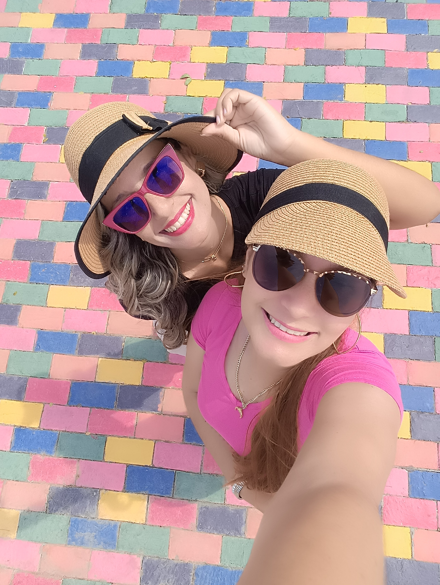 An overhead selfie photograph captures two adult females smiling against a backdrop of a colorful brick wall or paved surface in La Victoria, Venezuela. The surface consists of numerous rectangular bricks painted in various colors, including pastel pink, blue, yellow, and green. The woman positioned higher in the frame has light-colored, wavy hair, wears a black top, pink cat-eye sunglasses with reflective lenses, and a straw hat with a black band and bow. She is smiling, revealing teeth, and her left hand is positioned on the brim of her hat. She has gold earrings and a gold chain visible. The woman taking the selfie is positioned lower and to the right, has brownish-blonde hair, and wears a bright pink t-shirt. She is smiling, revealing teeth, and wears dark sunglasses with a patterned frame, large gold hoop earrings, and a gold chain necklace with a small pendant. Her right arm is extended, operating the camera. Both individuals are looking upwards towards the camera.