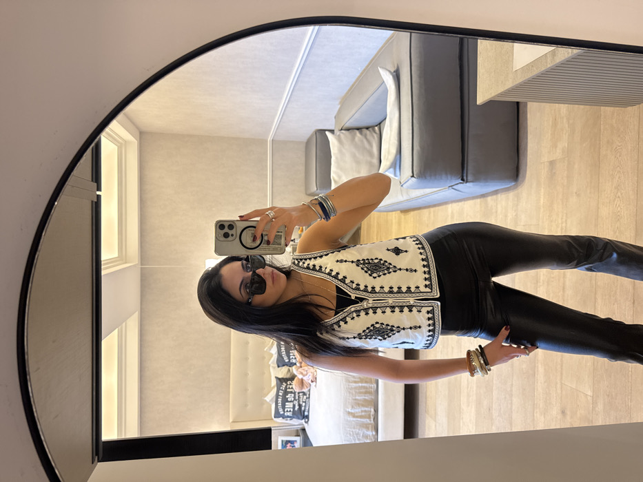 The image displays a dark-haired woman taking a mirror selfie indoors in Mexico City. She wears black sunglasses, a white sleeveless vest with black intricate embroidery, and black fitted pants. Her wrists are adorned with multiple bracelets, and rings are visible on her fingers. She holds a light-colored smartphone, equipped with a pop socket, in her right hand, angled towards the mirror. The background, reflected in the arch-topped mirror, reveals a modern interior space. To the left, a bed with a beige upholstered headboard, white bedding, and several pillows, one partially displaying "EN LOCATION," is visible. To the right, a grey modular sofa with a white cushion is positioned, next to a light-colored, possibly ribbed, cabinet or table. The walls feature light beige textured wallpaper with white trim and molding, and the floor is light-colored wood or laminate. The specific location within Mexico City is not discernible from the image's content.
