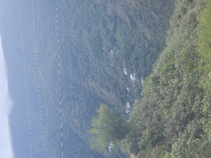 A verdant, mountainous landscape features dense foliage blanketing the slopes. Scattered white dwellings nestle among the trees, suggesting a small village. Several linear structures, likely electrical wires, vertically traverse the scene. A layer of haze partially obscures the distant mountains, lending a muted atmosphere to the vista. The angle of the shot provides a sweeping view down the mountainside.