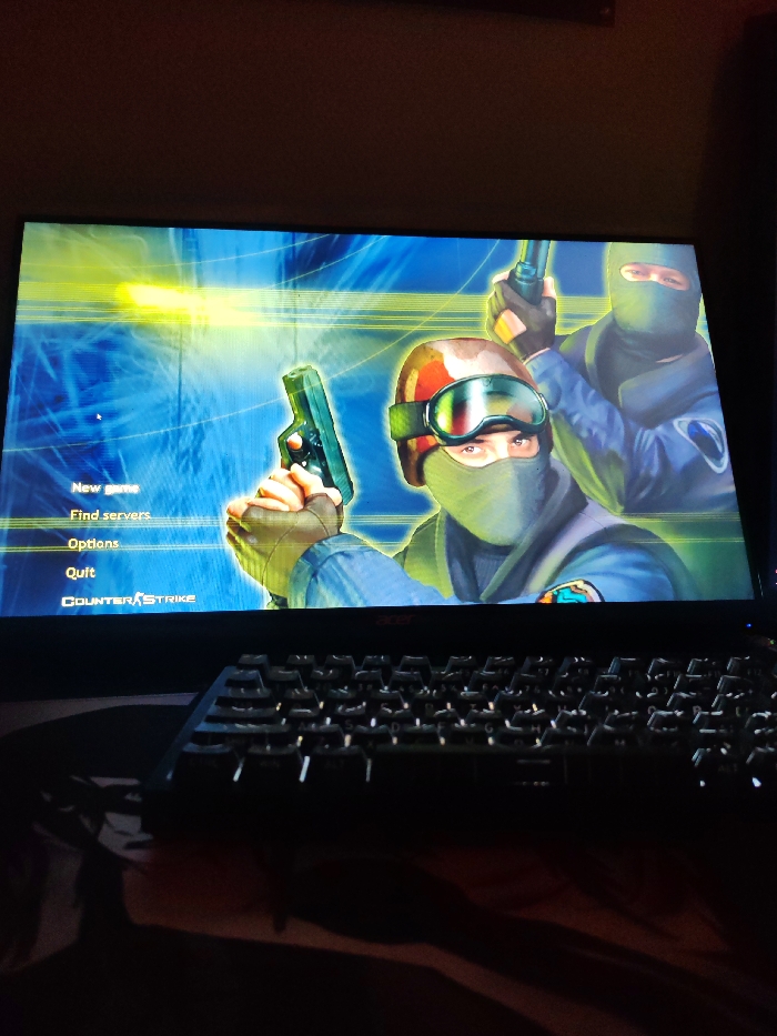 This image depicts an indoor scene in Bischheim, France, featuring a computer setup in a dimly lit environment. A dark-framed monitor, possibly an Acer model based on a faint logo on the lower bezel, occupies the central and upper portion of the frame. The monitor screen displays the main menu of the video game "Counter-Strike 1.6," identifiable by the game's logo and characteristic character models. The screen background features a stylized blue and yellow abstract design, with two masked figures in tactical attire. The foreground figure wears a helmet, goggles, and a green balaclava, holding a green pistol in a gloved hand. A second figure, wearing a dark balaclava, is visible behind, holding a different firearm. On the left side of the screen, menu options are displayed vertically: "New game," "Find servers," "Options," and "Quit," with the "Counter-Strike" logo at the bottom. The monitor screen exhibits vertical lines and glare artifacts. In the lower foreground, a dark-colored keyboard with visible, possibly backlit, keys rests on a reddish-brown surface, partially obscuring the bottom edge of the monitor. The surrounding environment is dark and indistinct.