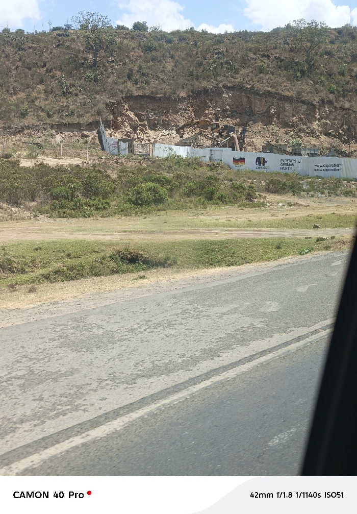 The image depicts an outdoor scene in Gilgil ward, Kenya, viewed from a vehicle. A two-lane asphalt road with a faded white centerline occupies the lower foreground, partially obscured on the right by a dark vehicle door frame. Beyond the road is a dirt and grassy shoulder with scattered low green bushes. In the midground, a construction site is visible, enclosed by a white corrugated metal fence. This fence features advertising for "Caparol" German paints, displaying a German flag and an elephant logo, along with text "EXPERIENCE GERMAN PAINTS" and a website address. Behind the fence, several pieces of heavy construction machinery, including excavators and loaders, are visible amidst excavated earth and rubble. The background is dominated by a dry, rocky hillside or cliff face with exposed reddish-brown soil and sparse, arid vegetation including scrub and occasional trees. The sky is light blue with scattered white clouds. No people or explicit actions are discernible.