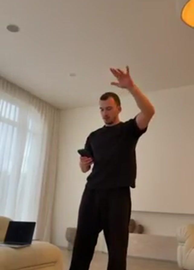 A man stands in a well-lit room, wearing a black t-shirt and black pants, barefoot on a light-colored carpet. He holds a phone in his left hand, looking at its screen, and moves his right hand above his head, gesturing with his fingers. A light-colored couch is on the left, with a laptop sitting on it. Behind the man is a decorative shelf with round objects and a cream-colored armchair. A large window with sheer curtains is on the left side of the frame. The ceiling is white, with a recessed light and a pendant light visible.