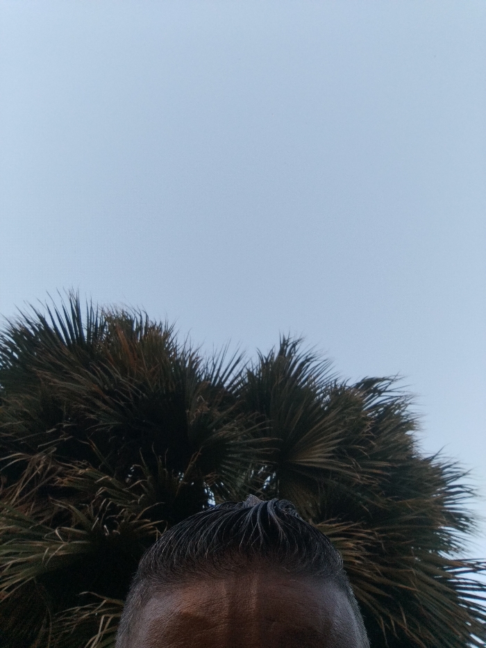 The image displays an upward-angled outdoor scene located in Meknes, Morocco. The upper two-thirds of the frame are dominated by a clear, light blue sky. Below, the dense, dark green and brown fronds of a palm tree canopy occupy the midground. In the immediate foreground, the top of a human head is visible, comprising a tan forehead with a subtle central vertical indentation, and short, dark hair styled upwards. No discernible actions or interactions are depicted.