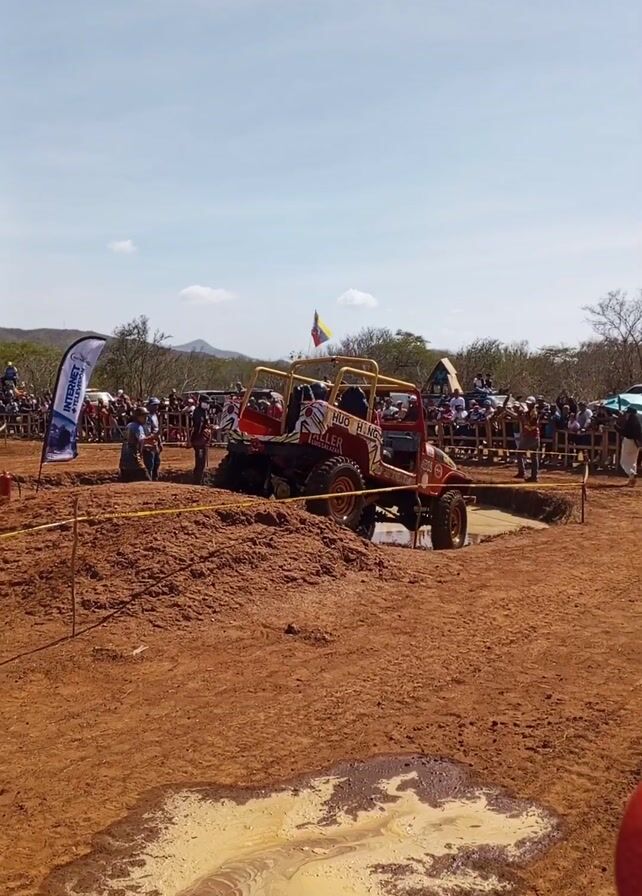 red off-road vehicle attempting to navigate a muddy obstacle course. A large crowd of spectators is visible behind a wooden fence, observing the competition. The vehicle is traversing a deep, water-filled trench, causing mud to splash as it moves. A yellow caution tape is visible near the edge of the trench. A flag is attached to the vehicle, possibly indicating the country of origin or affiliation. The surrounding environment is a dusty, outdoor area with sparse vegetation and a clear sky.