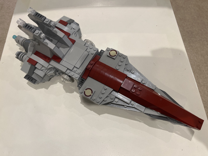 A LEGO model of a spacecraft, primarily light grey with dark red and dark grey accents, rests on a flat, white surface