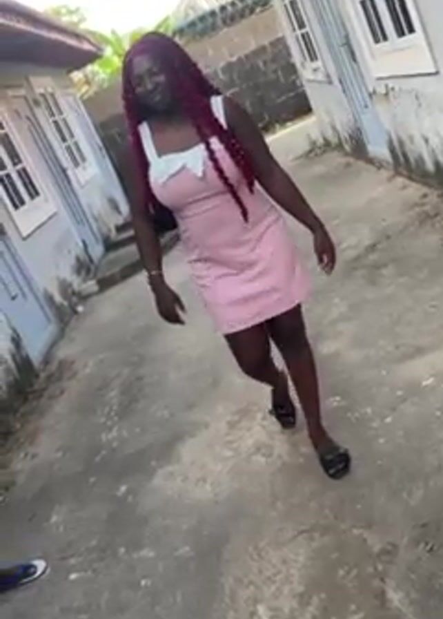 A woman with long, magenta-colored braided hair and a light pink dress is walking and laughing in a narrow outdoor space between two gray buildings. She is wearing black sandals. A person is partially visible in the lower left corner. The ground is concrete.