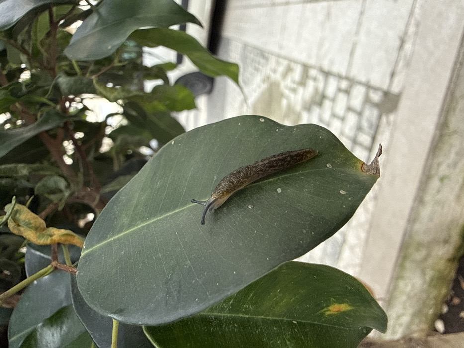 - "A brown slug, approximately 6 cm in length, with darker speckles and longitudinal stripes along its body, rests on the surface of a large, dark green, ovate leaf" by FM-EJFAu2, licensed under CC BY 4.0