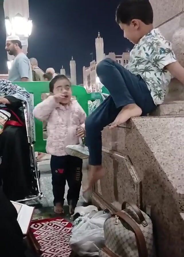 Here is a detailed description of the video: The video shows two young children in an outdoor setting, likely a public space. The younger child, a girl, stands barefoot on a patterned mat, wearing a pink jacket and dark pants. She is holding a white object in her hand and appears to be interacting with the older child. The older child, a boy, is sitting barefoot on a stone ledge or platform, wearing a patterned shirt and jeans. He is looking down at the girl. In the background, there are other people, including some wearing traditional Muslim attire. A wheelchair and several bags are also visible. The architecture in the background suggests the location might be near a mosque or religious site. The time appears to be nighttime, with artificial lighting illuminating the area.