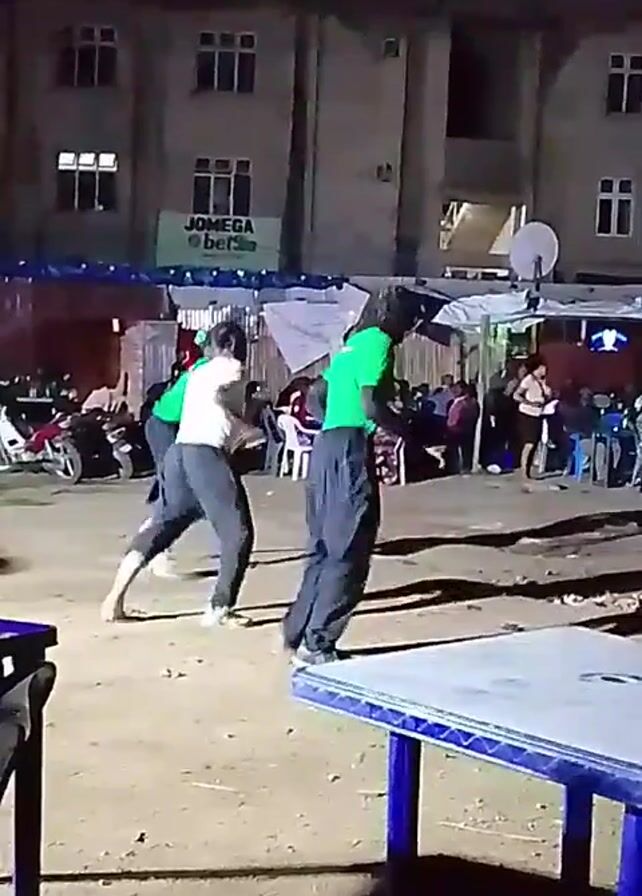 At night, three individuals in athletic wear are dancing outdoors in a dirt lot with a crowd of people in the background. Two of the dancers wear green shirts, while the other wears a white shirt. They move rhythmically, kicking their legs and swinging their arms in coordination with each other. Behind the dancers are several tables, a motorcycle, and stalls under blue-lit canopies. A multi-story building with multiple windows stands in the background. The area is illuminated by street lights and the canopies.