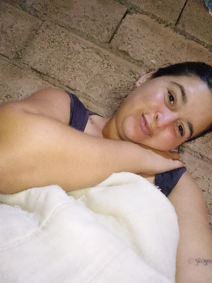 A single female individual is depicted in a close-up, eye-level shot, lying on her left side on a textured surface. She has dark hair pulled back, a light complexion, and a calm expression with a slight smile, looking directly at the camera. She wears a dark blue top, possibly a tank top or swimwear. A small stud earring is visible in her right ear. A light-colored, off-white blanket or towel covers her lower torso and legs, extending up her side. Her right arm is bent, with her forearm resting near her face, while her left arm is obscured by the blanket. A faint tattoo, possibly text, is visible on her left forearm/wrist. The background consists of a light brown or beige, rough, block-like surface, possibly coarse concrete or large natural stones, arranged horizontally. The lighting is soft and appears to be ambient. The precise location within Altagracia, Venezuela, cannot be determined from the visual evidence provided in the image.