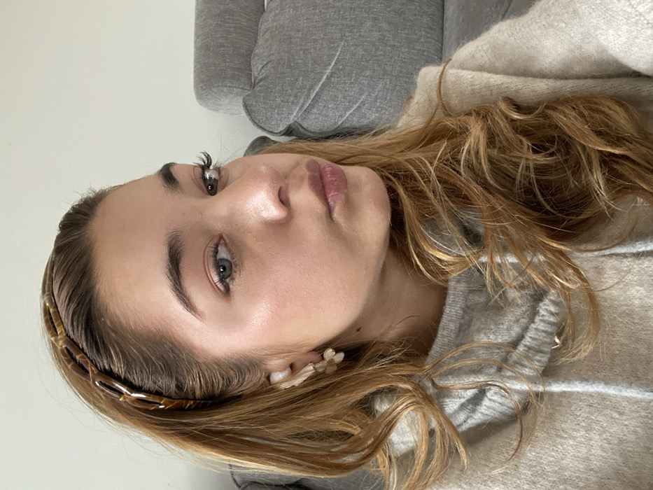 An indoor close-up photograph captures a young adult female situated within Täby, Sweden. The subject has long, wavy, light brown hair with lighter highlights, centrally parted, and wears a brown, tortoise-shell-patterned headband. Her facial features include light-colored eyes, a neutral expression with slightly pursed lips, and visible blush and enhanced eyelashes. She is attired in a light gray or off-white hooded pullover garment. A white earbud is present in her left ear, immediately above a small, multi-petaled white floral-shaped earring or ear cuff. Her head is turned slightly to the viewer's right, with her gaze directed off-camera to the viewer's left. The background consists of a plain, light-colored wall and a portion of a gray upholstered furniture piece, consistent with a sofa or chair.