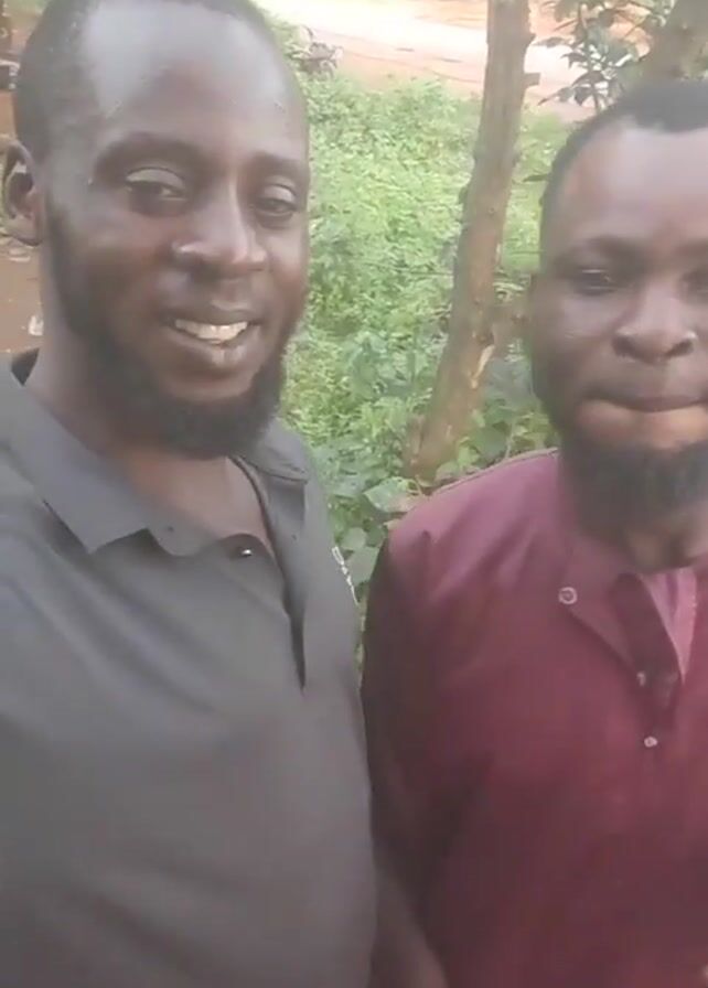 Two men stand side-by-side in front of a background of green foliage and trees. The man on the left wears a dark gray polo shirt and has a black beard and a partially shaved head. He smiles and points towards the camera. The man on the right is wearing a maroon shirt with buttons. He also has a beard. The background shows a blurred street and vegetation. The lighting is natural, suggesting an outdoor daytime setting.