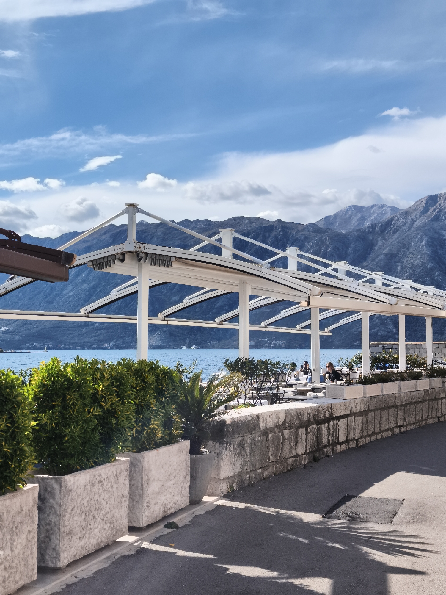A scenic view displays a waterfront cafe. White retractable awnings cover outdoor seating, where people dine. Lush green shrubs in stone planters line a low stone wall bordering a paved walkway. Beyond the cafe, blue water stretches towards towering mountains under a partly cloudy sky. The scene exudes a relaxed, coastal ambiance.