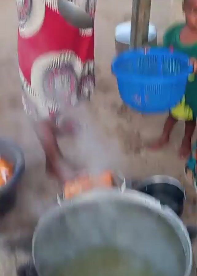 A woman in a red, white, and black patterned dress stands barefoot in a sandy area, tending to cooking pots. There is a large black basin filled with orange-colored packages next to a large silver pot simmering over an open fire. The woman dips some of the packages into the pot, then moves around, and the camera angle shifts. In the background are tree stumps, a white cloth, and various containers. The ground is sandy and bare. The cooking setup consists of large pots and a fire built on the ground. The woman is the only person clearly visible.