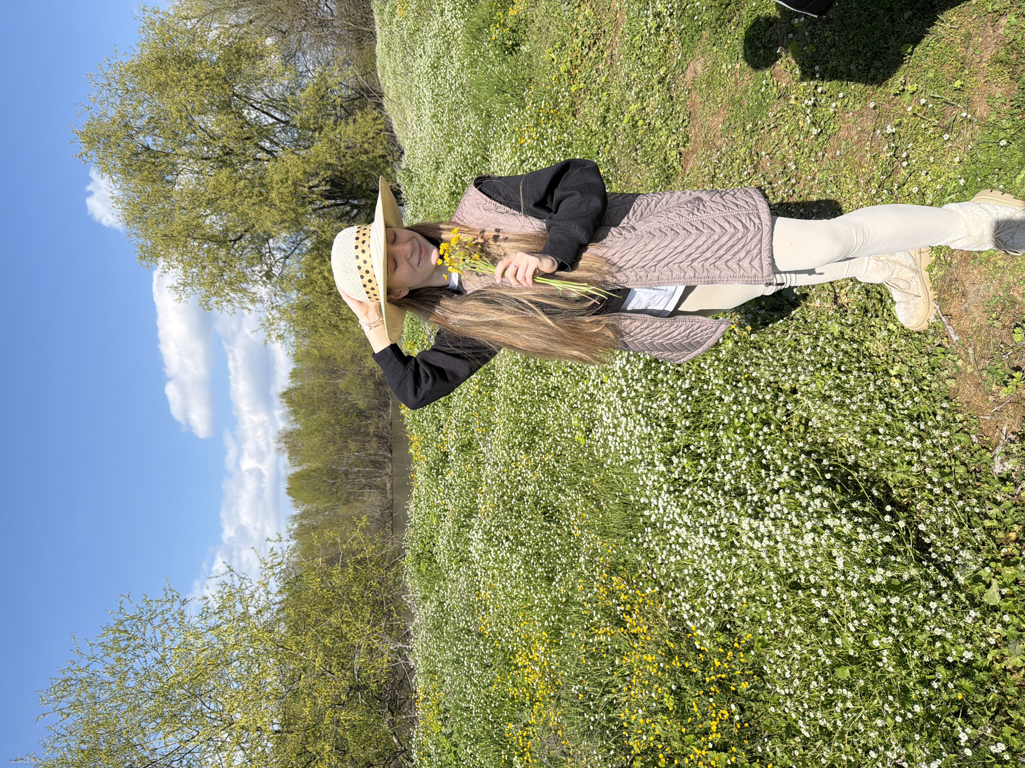 woman standing in a field of wildflowers on a sunny day. She is wearing a hat, a black shirt, a vest, light-colored leggings, and boots. She is holding a bouquet of yellow flowers. The background includes trees and a blue sky with clouds. The field contains white and yellow wildflowers. The location is Milevo, Bulgaria.
